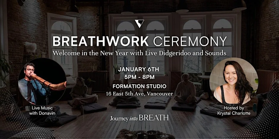 New Year Breathwork Ceremony Saturday, January 6, 2024 5:00 p.m. 8:00 p.m. Formation Studio 16 East 5th Avenue Vancouver, BC V5T 1G8 Canada (map) Google Calendar ICS New Year Breathwork CeremonyCome join us for this special New Year Breathwork Ceremony. We will have live didgeridoo and music to usher you into 2024. Get Tickets
